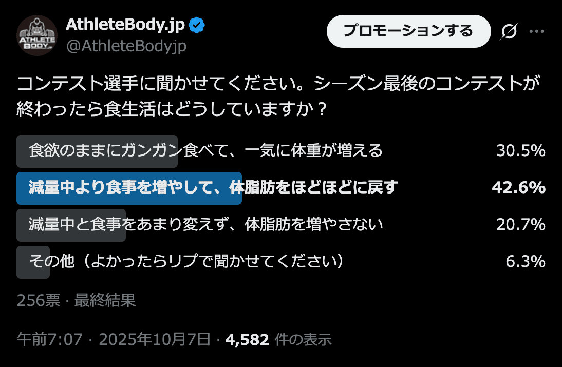 こんにちは、AthleteBodyの八百です! 毎週金曜日、フィットネス関連の情報をお送りしています。ぜひお付き合いください。 今日は減量後の食事管理についてお話します。 最近のボディビル道場セミナーでこのテーマを取り上げました。そして、それに関連して、Xでアンケートを行いました。 △ 減量後の過ごし方は人による コンテスト選手に限らず、減量でしっかり体脂肪を落としたあとは、できるだけ体形を維持したいと思うのは自然なことでしょう。ただ、人によっては厳しい食事制限から解放されて自由に過ごしたい気持ちになるのも理解できます。 このあたりは各個人の気持ちの部分が大きいですが、客観的に見たときにベストな選択はあるのでしょうか。 AthleteBody的にオススメしたいのは、体脂肪をほどほどに戻すスタイルです。 肉体改造のピラミッドでは、ギリギリまで絞ったあとは1〜2ヶ月で体重を5〜10%ほど戻すくらいをオススメしました。ガチガチである必要はないですが、迷ったらこの数字を目安にしてください。(本をお持ちの方はP.205をご参照ください。)...