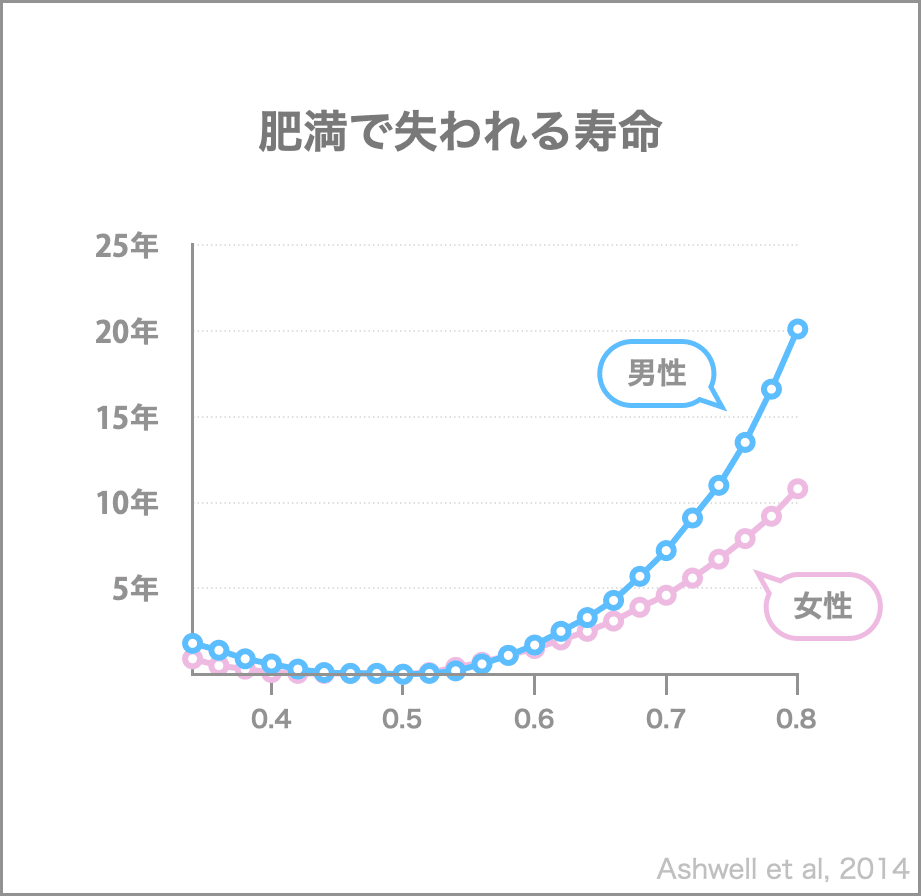 毎週金曜日、フィットネス関連の情報をお送りしています。ぜひお付き合いください。 今日のテーマは内臓脂肪と健康です。筋肉を増やすために増量をするトレーニーには特に気にしてもらいたいお話です。 筋肉を付けるには、カロリー収支をプラスにすると効率が上がります。ただ、ほとんどの場合で筋肉だけでなく体脂肪も増えることになります。 体脂肪が増えると腹筋が隠れてしまうのが気になると思いますが、お腹まわりの体脂肪は健康にも影響を与えます。 体脂肪には大きく分けて「皮下脂肪」と「内臓脂肪」の2種類があります。減量するとどちらも減って、増量するとどちらも増えます。 内臓脂肪は文字どおり内臓に蓄積される脂肪で、これが多くなると糖尿病、脂肪肝といった生活習慣病のリスクが高くなります。 病気を避けるには増量期に太り過ぎないことが大切です。ただ、そうは言っても筋肉を増やすために増量は必要ですし、どこまでならOKなのか判断に困りますよね。 健康診断に行くと、お腹まわりのサイズやBMIの数値に基づいて、お医者さんから「ヤセなさい」と注意を受けた経験のある人もいるかと思います。 トレーニーの場合、ここで話を難しくするのが筋肉です。BMIは体重に基づいて計算されるので、筋肉の多い人は腹筋が見えている状態でも肥満と言われてしまったりします。これでは役に立ちません。 お腹まわりのサイズも内臓脂肪の量を大まかに推定する程度で、あまり頼りになりません。また、身長の高い人はお腹まわりのサイズも大きくなるので、ひとつの基準をすべての人に当てはめるのに無理があります。 そこで使えるのが「腹囲と身長の比率」です。お腹まわりのサイズを測って身長で割るだけなので、普通の人が手軽に求めることができます。 例えば、身長170cmの人が腹囲85cmであれば比率は0.5となります。 この腹囲身長比と寿命の関係を調べた研究があります。イギリス国民の健康状態について数十年にわたって調査したデータを分析したところ、腹囲身長比が高い人は明確に寿命が短いという関係が見られました。 このグラフは30歳の男女を対象としています。男性の方が肥満による影響は深刻になりやすいようで、腹囲身長比が0.8になると、寿命が20年以上短くなってしまうという推定です。 この研究の論文では0.5を目安として、0.6では生活改善を検討するように勧めています。身長170cmなら腹囲85cmまではOKで、100cmほどになると要注意という数字です。 ちなみに、内臓脂肪を正確に測るにはCTスキャンなどの検査が必要です。さらに、生活習慣病そのものは血液検査などで調べるものです。 つまり、腹囲身長比ですべてが分かるわけではありません。それでも、いつでも自分でチェックできるものなので、ぜひ増量中に意識してみてください。 せっかくのフィットネス生活が知らないうちに健康を壊してしまうことのないよう、役立ててもらえれば嬉しいです。 では、次回のメルマガをお楽しみに! |
