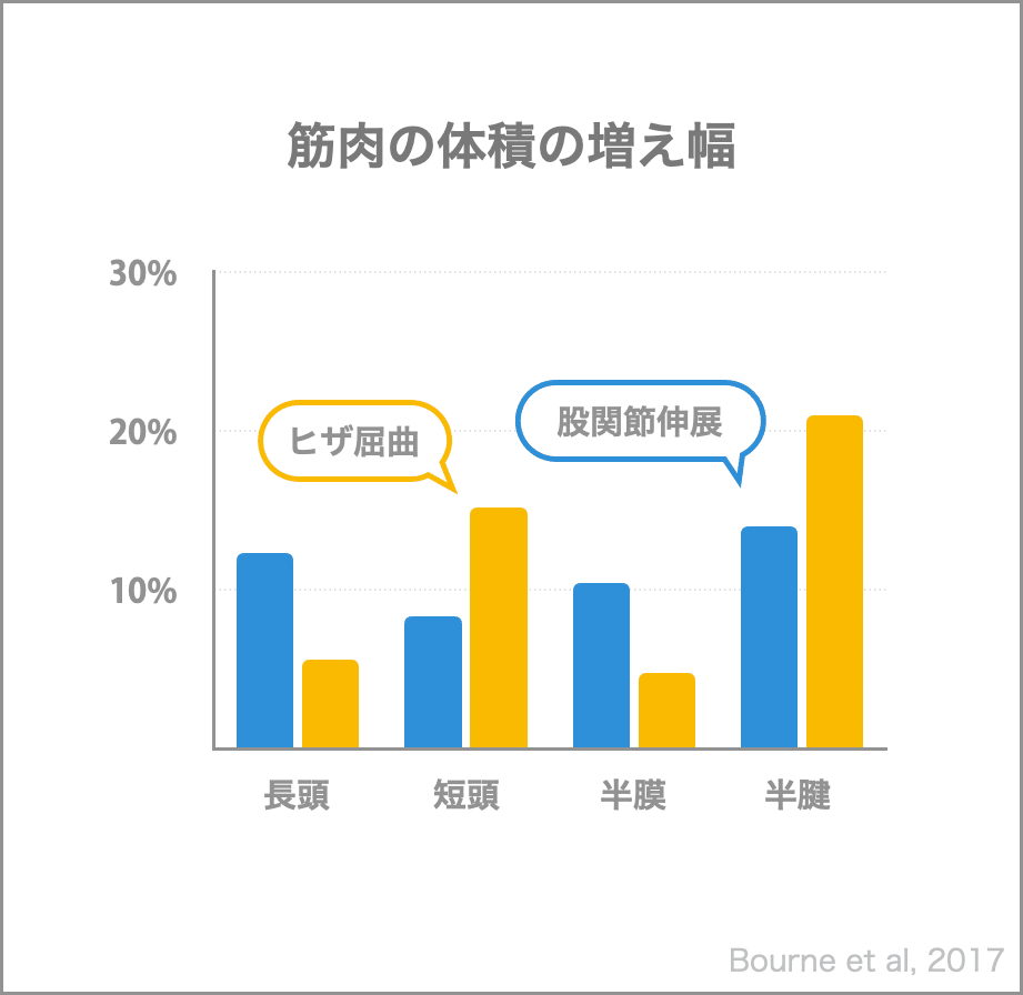 この中で、大腿二頭筋の短頭はヒザの動作でのみ働く小さな筋肉です。その他の部位は股関節とヒザ両方の動作に関わっていて、ハムストリングの大部分を占めています。 つまり、理屈上はどちらの関節を動かしてもハムストリングの大部分に負荷をかけられることになります。 では、種目によって効果に違いはないのかという疑問が出てくるわけですが、細かな違いを調べる研究が進められています。 今日紹介する研究では、45°バックエクステンションとノルディックカールが比較されました。これは、股関節を動かす種目とヒザを動かす種目として見ることができます。 10週間のトレーニングを行い、ハムストリング各部の筋量を測定したところ、以下のような結果になりました。 ヒザを曲げるノルディックカールでは、大腿二頭筋の短頭と半腱様筋で明確に効果が高くなりました。 股関節を動かす45°バックエクステンションでは、大腿二頭筋の長頭と半膜様筋で効果が高くなりました。 種目によって、各部位の筋肥大効果には明確な違いがあるようですね。 ハムストリング全体をもらすことなく鍛えるには、股関節とヒザの種目どちらも行うのが良さそうです。 ハムストリングの中でも短頭は小さな筋肉で、長頭や半膜様筋の方が大きいので、どうしてもひとつだけで終わらせたいという場合には、股関節種目を優先するのはアリかもしれません。 種目選びには絶対の正解があるわけではありません。ご自身が使えるトレーニング用品、動作に慣れている種目、疲労を抑えて続けやすい種目といったことも大切です。それでも判断材料が増えると楽しいですね。 みなさんが脚トレを考える足しにしてもらえると嬉しいです。 では、また次回のメルマガで! |