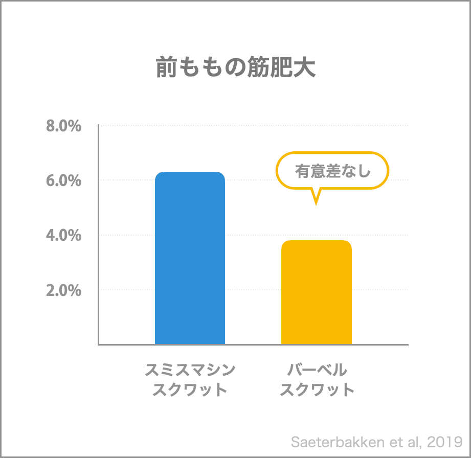 こんにちは、AthleteBodyの八百です! 毎週金曜日、フィットネス関連の情報をお送りしています。ぜひお付き合いください。 今日のテーマはスミスマシンとバーベルで行うスクワット比較です。 スクワットと言えばバーベルが定番ですが、スミスマシンで行うこともできます。 スミスマシンはバーの軌道が固定されており、動作が安定しやすいのが良いと言われたり、動作が制限されるのがダメと言われたりします。 トレーニング種目は目的に合うかどうかが重要ですが、筋肥大を目指す場合にはどうなのでしょうか。 今回紹介する研究では、スミスマシンとバーベルでスクワットを行いました。6週間のトレーニングで太ももの筋肉の成長を測ったところ、以下のような結果になりました。 筋肥大効果はスミスマシンで6.3%、バーベルでは3.8%となりました。 スミスマシンの方が効果が高いように見えますが、このデータを統計的に分析したところ、「有意差なし」と判断されました。 トレーニング効果には条件によってバラつきが出るものなので、この程度の違いであれば、状況次第で大きな差が出ないかもしれないという意味です。 ただ、スミスマシンがバーベルより効果が低いわけではないと示すデータは重要です。 バーベルスクワットは動作の自由度が高いので、全身の筋肉を使って身体を安定させる必要があります。 体幹を固めたり、前後のバランスを取ったりすることに意識を向けていると、下半身が全力を出す前に疲れてしまう人もいるでしょう。 もし、バーベルスクワットでは最後まで集中力を保つのがキツいと感じるようなら、スミスマシンの方が脚に負荷をかけやすかったり、セット数をこなしやすかったりすることもありそうです。 太ももの筋肥大に限って言うとスミスマシンは効果が劣るわけではないようなので、バーベルスクワットであまり成果を感じられていない人は、試してみても良いかもしれません。 では、また次回のメルマガで! |